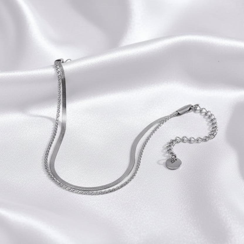 A sleek, dual-layered gold anklet that exudes minimalist charm and sophistication. Perfect for cocktail nights, date evenings, and upscale celebrations.