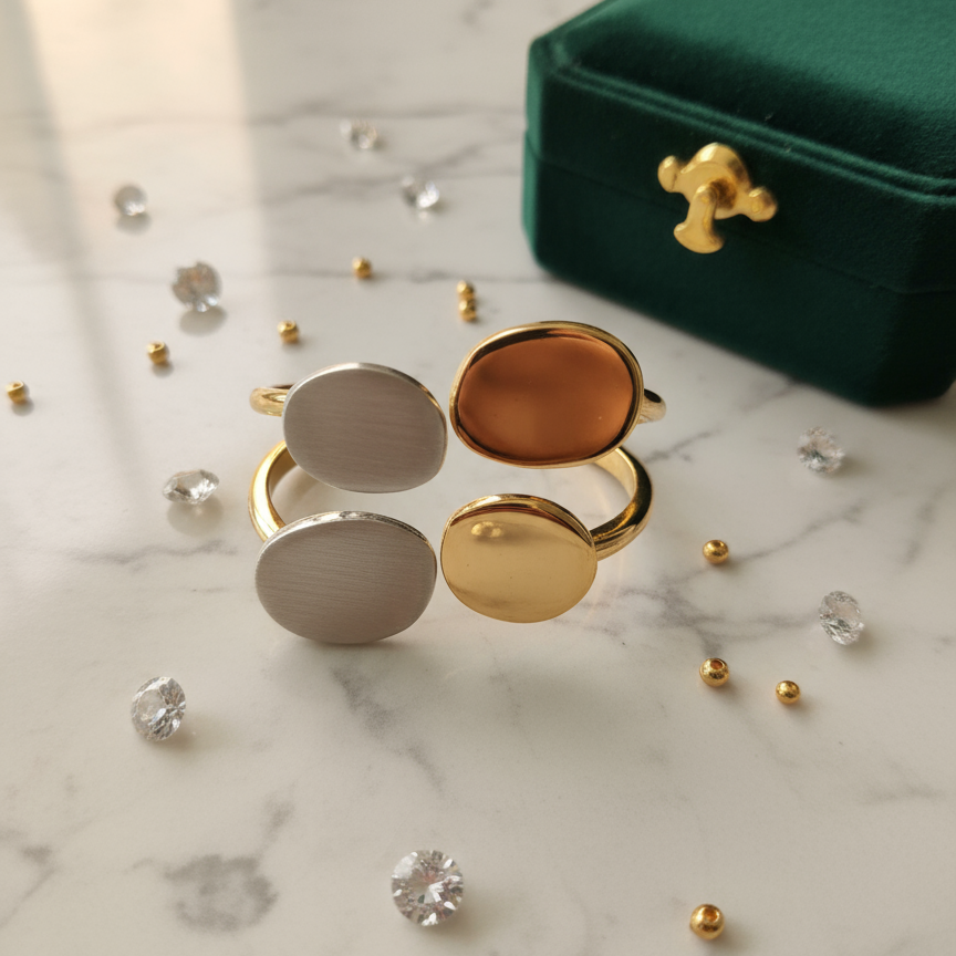 A modern artistic cuff set featuring smooth dual-tone disc motifs in glossy gold and matte metallic finish. Sculptural, chic, and bold — perfect for cocktail nights, luxury brunches, and statement evening looks.