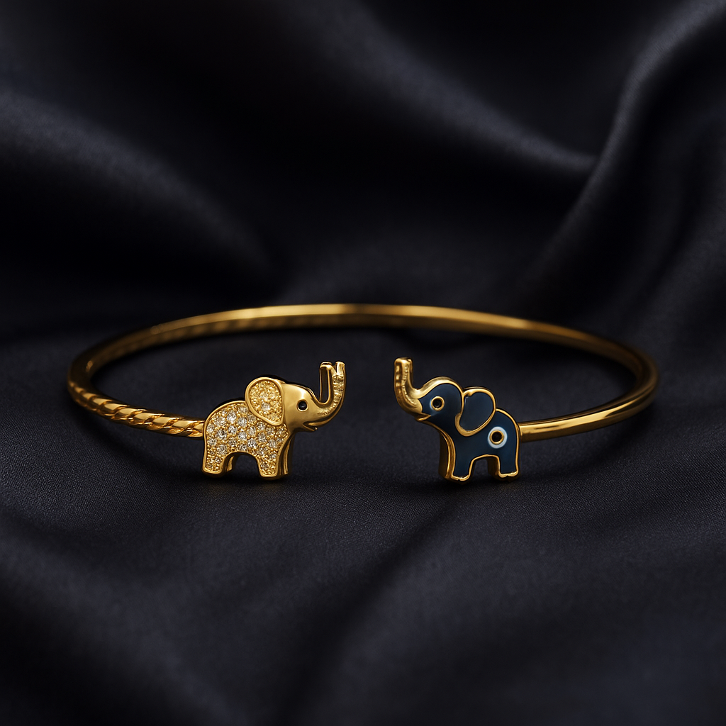 This elegant 14K gold plated bracelet features twin elephant charms one adorned with sparkling crystals and the other with a protective evil-eye motif, symbolizing strength and positivity. Perfect for festive occasions, gifting, and everyday elegance.