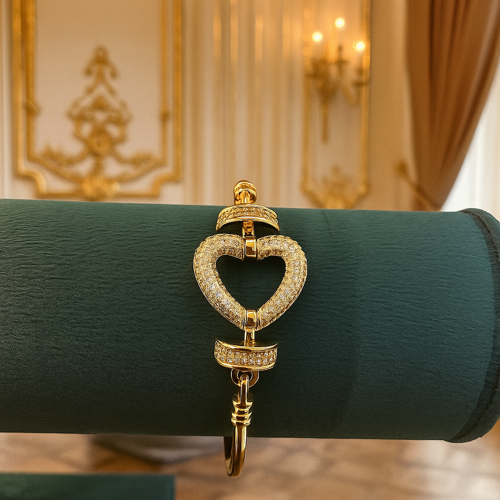 A rose gold bangle bracelet with a soft curve and a pavé-studded heart centrepiece. Perfect for intimate dinners or festive soirées.