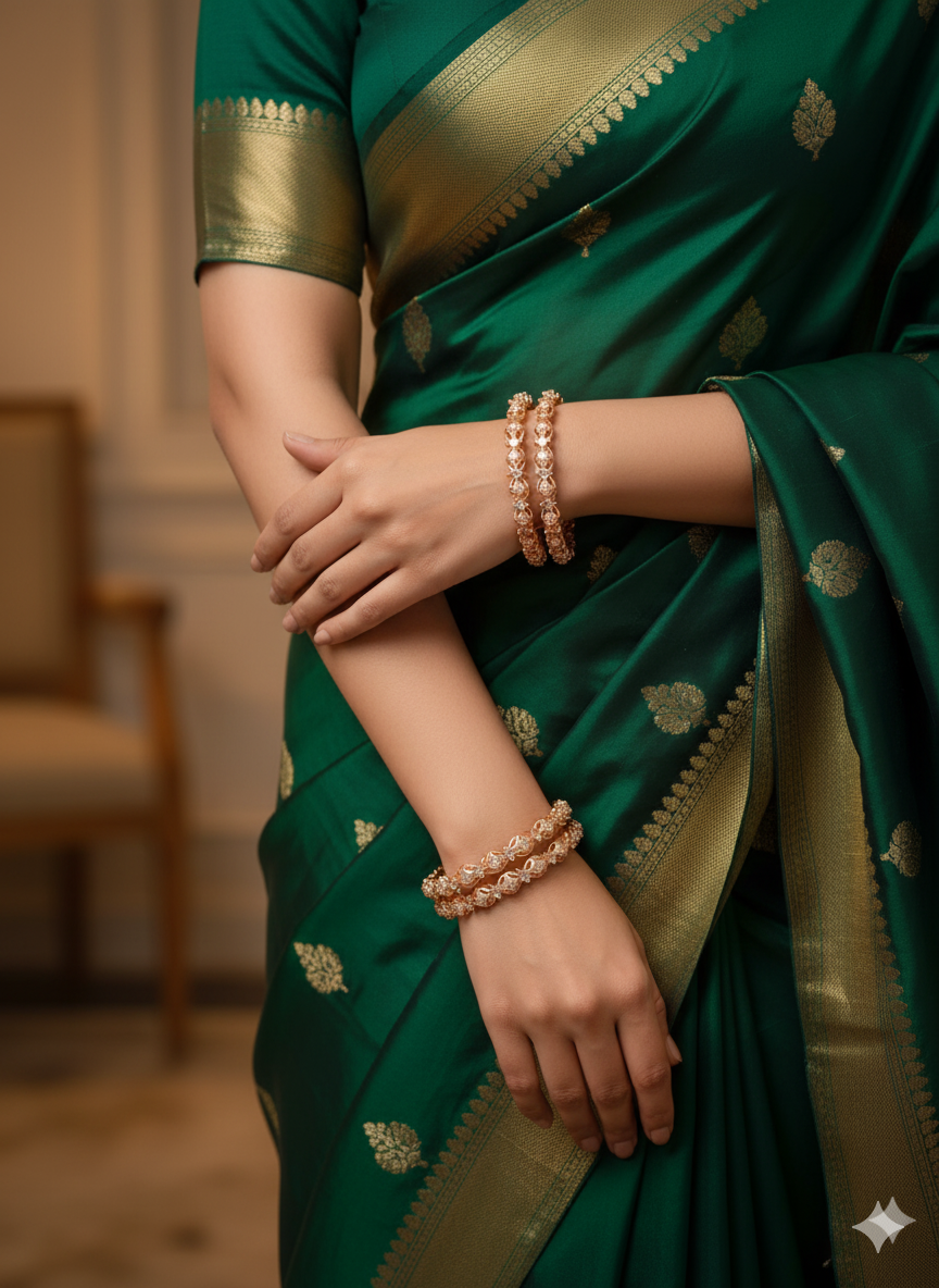 These rose gold bangles feature an intricate floral-inspired design set with brilliant A.D. diamonds, giving them a graceful and timeless appeal. Perfect for weddings, festive occasions, and traditional celebrations.