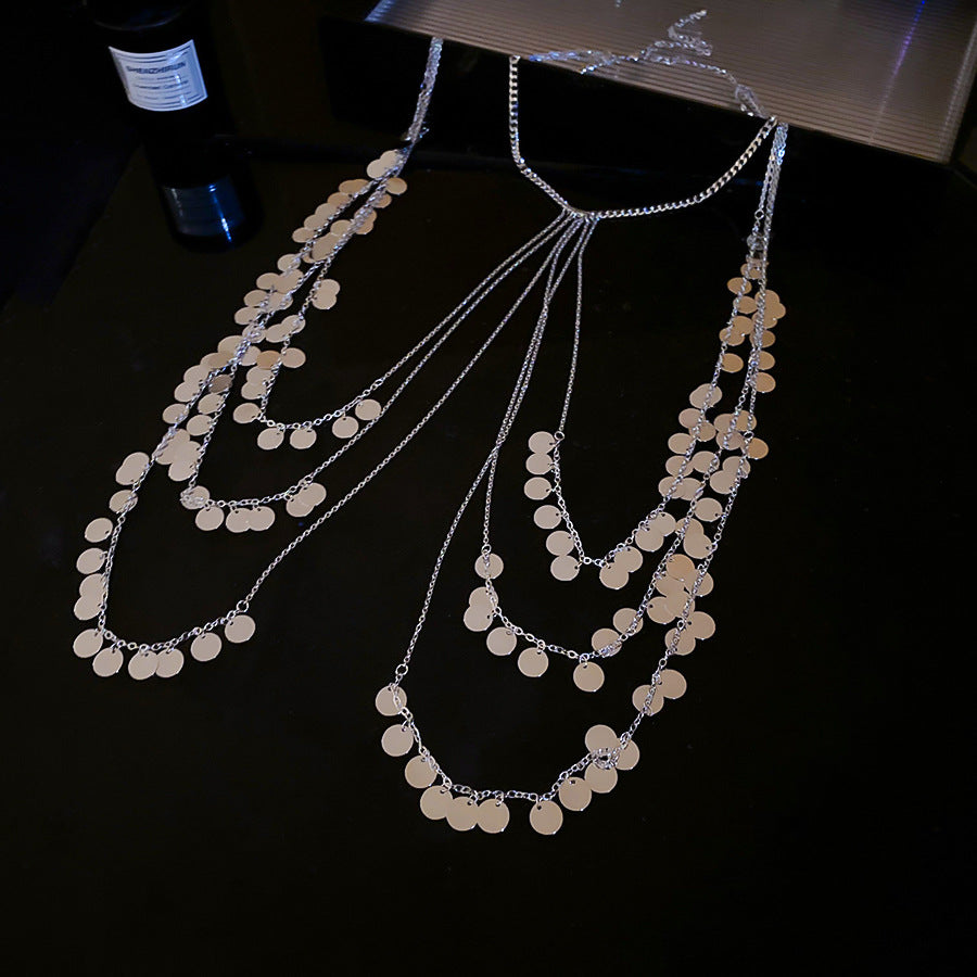 A statement shoulder harness in silver-tone with cascading disc chains for an ultra-bold, boho-chic look. Perfect for parties, weddings, red carpet events, glam evenings, fashion photoshoots, and luxe celebrations.