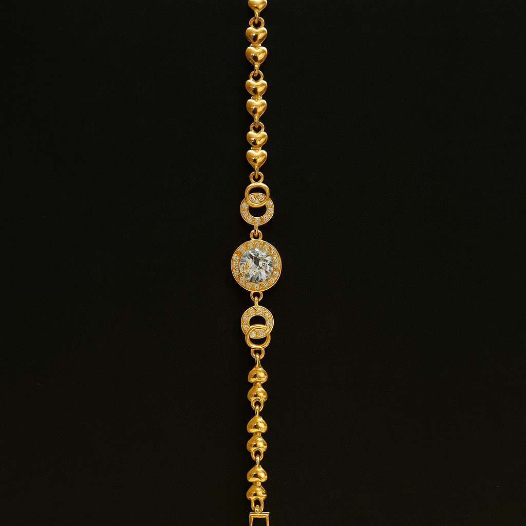 This charming rose gold bracelet features a string of dainty heart-shaped links, centered with a brilliant circular solitaire and delicate accents. Perfect for romantic evenings, date nights, or festive gatherings.