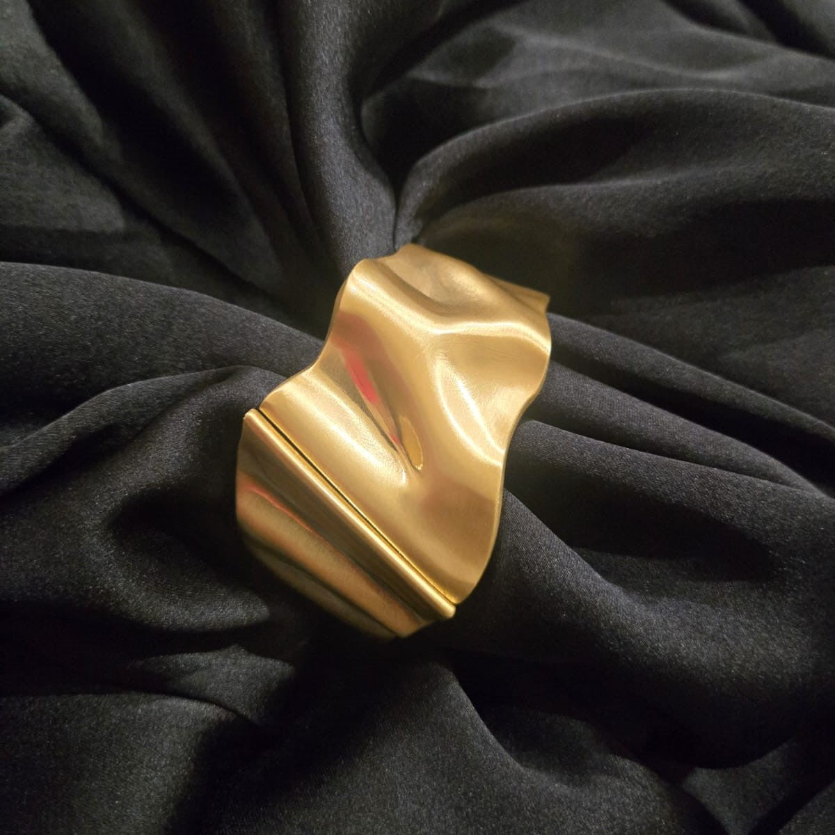 A sculpted molten-effect gold cuff that mimics soft draped metal, creating a luxurious fluid silhouette on your wrist. Perfect for cocktail nights, festive occasions, and high-fashion statement looks.
