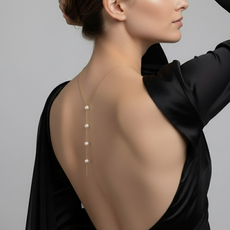 A delicate gold back chain adorned with lustrous pearl drops, designed to gracefully highlight your back with elegance and charm. Perfect for cocktail evenings, weddings, and special celebrations.
