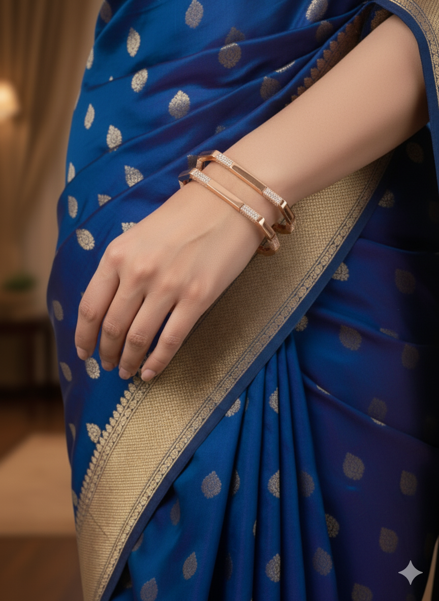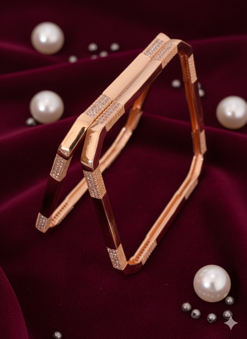 Elegant square-shaped rose gold bangles featuring a modern prism-like design with intricate AD diamond work. Perfect for festive occasions and special celebrations.